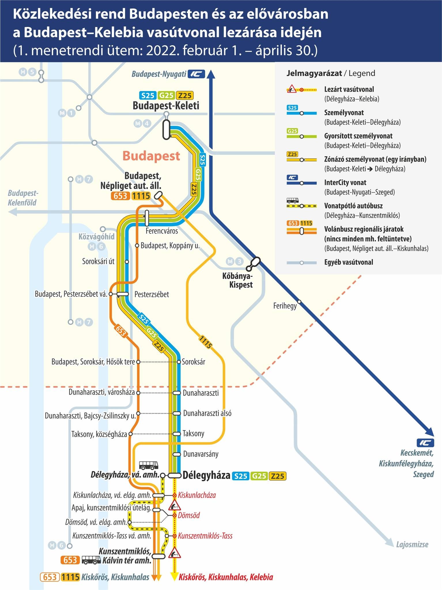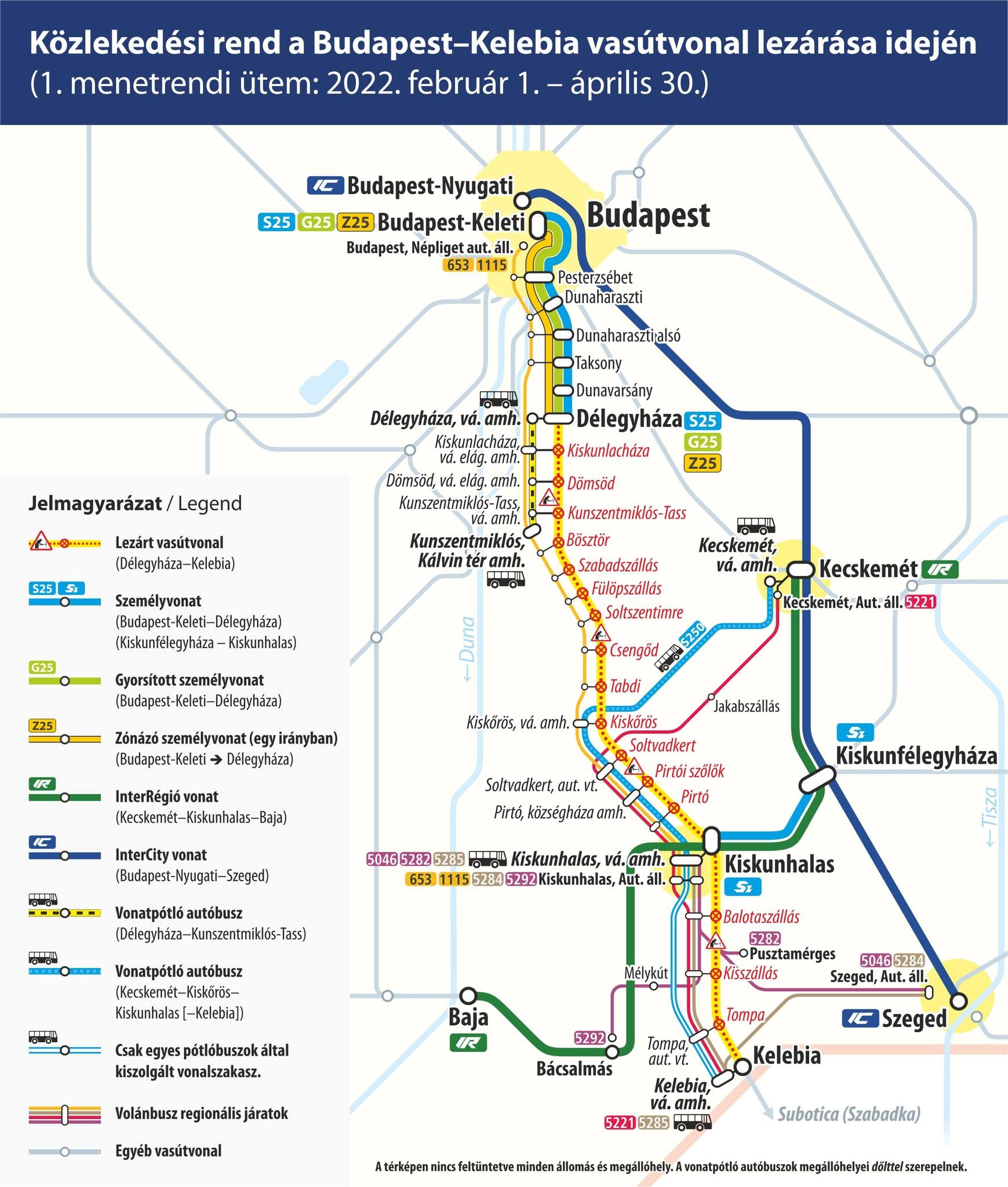 Ennek oka, hogy újabb jelentős fázisához érkezett a Budapestet Belgráddal összekötő vasútvonal magyarországi szakaszának felújítása. Február 1-jétől már Délegyháza és Kelebia között vágányzár mellett folytatódik a kivitelezés. A Budapest–Kunszentmiklós-Tass–Kelebia (150-es számú) vasútvonal több évig tartó átépítésének első menetrendi üteme idén április 30-ig lesz érvényben. Ebben az időszakban a vonatok csak Budapest és Délegyháza között közlekednek. A Délegyháza–Kiskunhalas–Kelebia szakaszon vonatpótló autóbuszokkal, valamint a Volánbusz helyközi és távolsági járataival lehet utazni, ezek közlekedése a lezárás idejére a térségben megváltozik, és átveszi az érintett települések teljes kiszolgálását. Az utazóknak ezekkel a változásokkal számolni kell, mielőtt útnak indulnak.